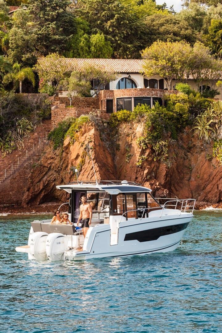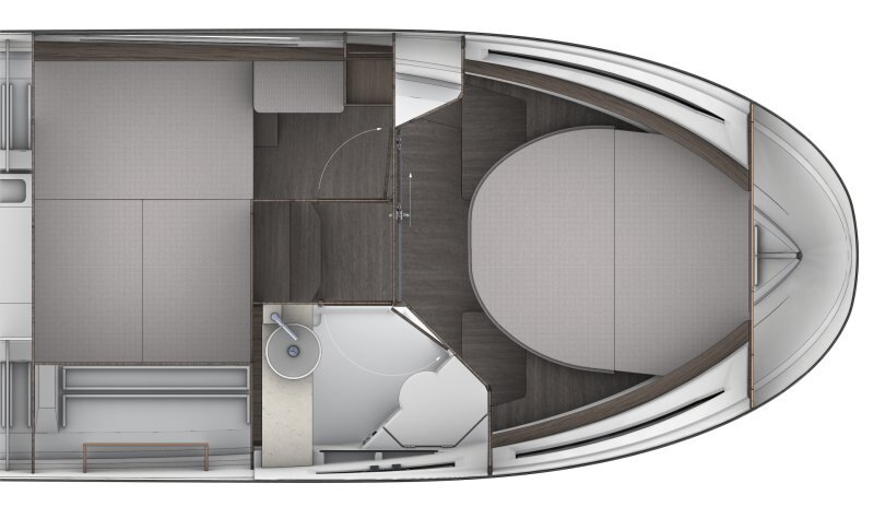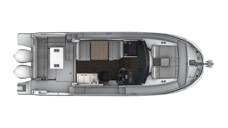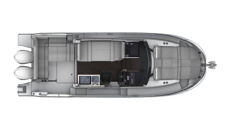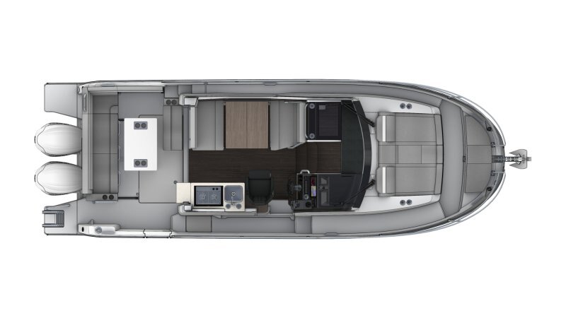 This new version integrates an elongated line, inspired by larger models of the new generation. Contemporary windows in the hull and the coachroof, with its distinctive design, integrate seamlessly into a powerful, sporty silhouette. The new hull enables planing from 20 knots, a speed easily obtained with its twin engines, 2 x 250 HP at maximum speed, ensuring comfort and manoeuvrability.